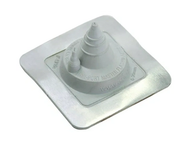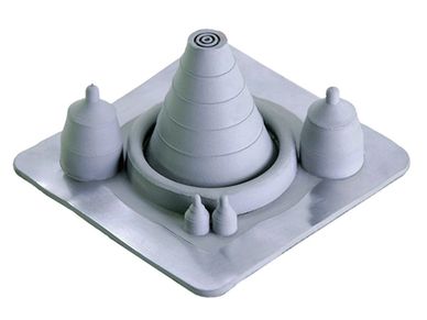 Excellent for solar hardware, this (5) port design is 4-1/2" square base x 2-1/2" tall flashing: